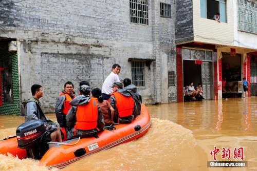 5月23日,受近日连降大雨到暴雨、局部特大暴雨影响,广东怀集境内江河水位急剧上涨,县城绥江水位52.36米,超警戒2.36米,县城绥江河沿江路部分路段受浸。凌晨3时,怀城镇政府组织镇、村干部通过打锣、敲门等方式及时通知县城沿江群众注意绥江水位,及时转移。目前,该县社会秩序正常,受灾群众已得到安全转移和妥善安置,无发生人员伤亡事故报告。图为消防官兵出动橡皮艇搜救受灾居民。