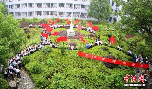 5月26日,湖南一高中的18个毕业班用举红旗的方式向2015年高考“宣战”。与此同时,该校高一、二年级的学弟学妹们也齐聚楼下,为参加高考的学生加油助威。当天距2015年全国高考大幕开启还有11天。中新社发曹正平 摄