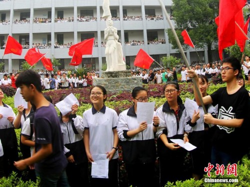 5月26日,湖南一高中的18个毕业班用举红旗的方式向2015年高考“宣战”。与此同时,该校高一、二年级的学弟学妹们也齐聚楼下,为参加高考的学生加油助威。当天距2015年全国高考大幕开启还有11天。中新社发曹正平 摄