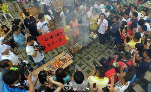2015年06月20日,河南省三门峡市,河南三门峡豫西大峡谷万人烧烤漂流节上,三名比基尼女郎支起烧烤摊,有模有样的烧烤羊肉串,叫卖一百元一串,并打出招牌“烧烤小鲜肉百元一串”,还有萨克斯男现场忘我演奏助兴,吸引众多群众现场围观,但购买者寥寥无几。大家纷纷质疑售价过高,而售卖者却称,这些都是小羔羊优质鲜嫩肉,与众不同,物有所值。