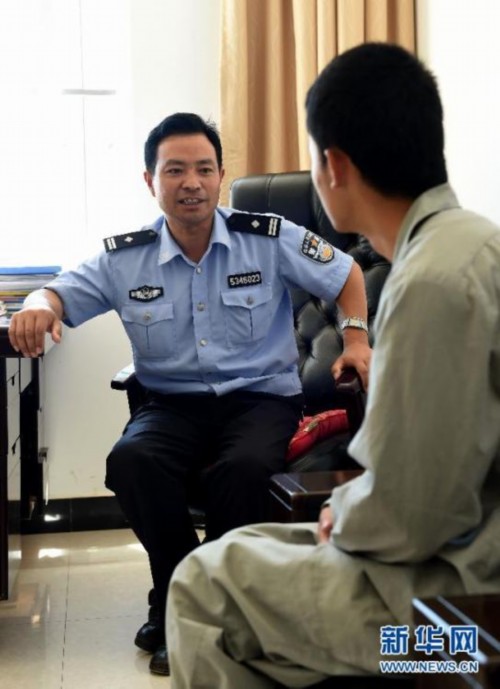 阿龙说:“我非常痛恨那段吸毒的经历,差点就毁了我。现在最大的愿望就是出去以后马上回家,好好孝敬我的妈妈,不再让她操心了。”图为帮教民警和阿龙(右)谈心(6月23日摄)。新华社记者蔺以光 摄 图片来源:新华网