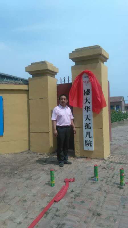 6月初,中华蓝天儿童村(孤儿院)的负责人通过微信联系上该集团的领导,6月21日集团领导实地考察了孤儿院,孤儿院的负责人说孤儿院盖楼、孤儿教育等需要80万元左右资金。集团领导表示公司出资50万元成立爱心基金,用于盖楼和助学,以改善孤儿生活条件。随后集团安排员工购买了书包、书本等学习用品。6月25日,该集团特地举办了一场主题为“中国梦盛大华天梦会盟世界的梦”研讨会,并到孤儿院接来了21名(15名男孩、6名女孩)孤儿参会,研讨会共有两三千人参加。会上,爱心基金成立,并为孤儿们举行大型捐款活动。当孤儿代表到台上说出“我没有爸爸妈妈,你们就是我的爸爸妈妈”时,会场上众人唏嘘不已,现场共捐款1.7万余元。图为孤儿院负责人李某在孤儿院前。