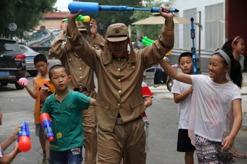 山东景区现儿童扮“八路军” 持水枪打“鬼子”