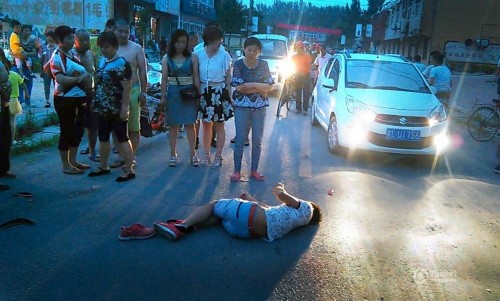 2015年7月10日傍晚,安徽淮北段园镇毛庄村的大路上,一名二十多岁青年驾驶摩托车与一辆白色小轿车发生碰撞后摔在路上奄奄一息,几十名路人围观却无人拨打120。十余分钟后倒地青年艰难地从口袋里掏出手机,用微弱的声音拨打120自救。