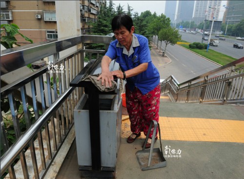 平时,冀凤云会和丈夫樊庆考一起上天桥打扫卫生。由于前不久樊庆考在桥上打扫卫生时不慎脚底扎进一颗钉子,住院治疗近一个月,这段时间都是她上桥清扫。(张伟摄)