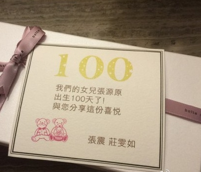 据台湾“东森新闻”消息,2013年,张震和助理女友庄雯如结婚,2015年3月10日正式迎接女儿“丫丫”到来。近日,他特地在女儿满100天的日子里,正式公开女儿真实姓名,同时为亲友送出礼物。 张震特地订制了和孩子生肖一样的小羊饼干分送给亲友,其中,郭富城的经纪人小美也收到了礼物,并在收到后将礼物拍下,分享到微博中,张家千金的真实姓名也公布于世,名叫“张源原”。