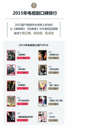 《花千骨》、《琅琊榜》、《伪装者》、《武媚娘传奇》、《何以笙箫默》等是霸占着“2015年热播剧网络点击量排行”、“这一年,讨论的话题里总有电视剧”、“2015热播剧平均收视TOP10”等榜单。不过正所谓高收视不等于好口碑,在“2015电视剧口碑TOP10”的排名中,依然能让人欣慰的是,《老农民》、《平凡的世界》、《刑警队长》、《嘿!老头》等彰显创作者情怀的好剧。在2015最受关注的演员评选中,男演员呈现中生代、小鲜肉和帅大叔三分天下的局面。霍建华、李易峰、杨洋排名前三,钟汉良、胡歌等紧随其后,而今年迅速蹿红、圈粉无数的王凯和靳东也入围前十。令人遗憾的是,传统的实力派男演员均榜上无名。女演员入围前十的都是借力作品,既有“劳模式”演员唐嫣、赵丽颖等,也有仅凭一部戏就稳坐榜单的范冰冰(《武媚娘传奇》)、赵薇(《虎妈猫爸》)、孙俪(《芈月传》)等。(冯遐)