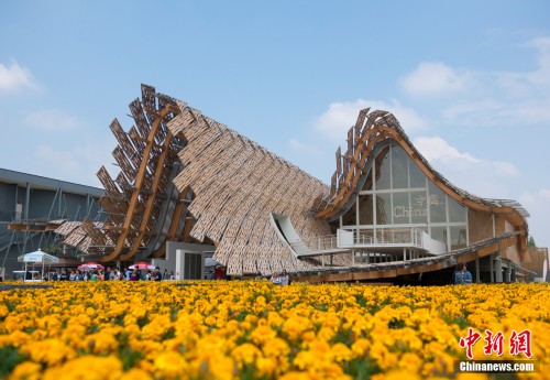 图为坐落在花海之中的中国馆,麦浪的造型让人过目难忘。中新网记者 李卿 摄