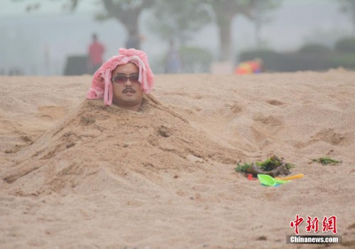 2011年7月1日,青岛第一海水浴场内一位男士将自己埋在沙里消暑。中新社发 黄杰显 摄 图片来源:CNSPHOTO