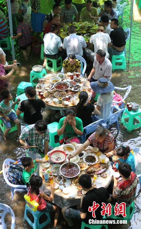 2014年7月26日,重庆北碚偏岩古镇河滩上,数百张餐桌铺在河床上,人们赤脚浸泡在清凉的河水中大块吃肉、大碗喝酒,场面相当壮观。由于重庆的夏天相当炎热,当地餐饮店老板便想出奇招,把餐厅开在水里经营,让前来玩耍的市民,不仅能够歇凉,更是能够品尝当地的农家美食。图为重庆北碚偏岩古镇,市民在水中吃饭享受清凉。周毅摄