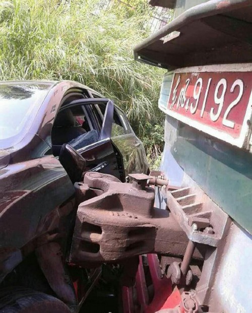 然而,车的前轮轧过铁轨之后,突然熄火了。此时,火车就在百米之外!他赶紧重新点火,可是点了两次都没能启动,眼看火车离自己只剩三四十米了,林先生立马下车,拉开后门把父亲也拉了出来,躲到边上。图为汽车与火车相撞画面。