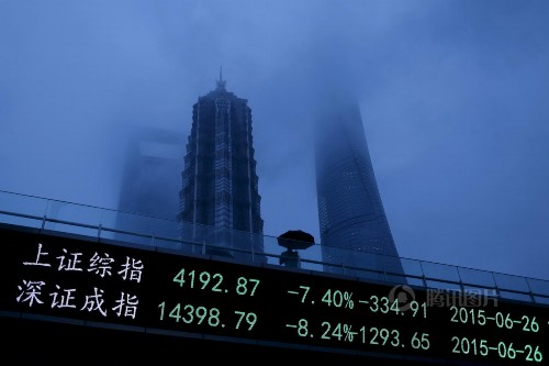 6月15日至今,短短半个月时间,中国股市从5178点跌到最低3421点,跌幅超过30%。这种非正常下跌历史罕见,创下了1992年来最大的三周跌幅。依据发达国家的定义,股市连续下跌20%可称为“股灾”。中国虽然不是发达国家,但30%的跌幅也足以算作“股灾”。图为6月月26日,上证综指暴跌7.40%,创下年初以来最大单日跌幅,当天上海陆家嘴金融区阴云密布,暴雨欲来。