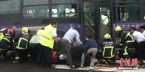 7月8日15时05分许,浙江宁波江东区惊驾路一岔口发生交通事故,其中1名老人连人带车被压入车底,危急时刻,路过的市民纷纷伸出双手,将公交车推起来为消防官兵提供救援了空间。摄影:何蒋勇
