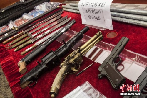 7月9日,广东省公安厅内展示的涉案物品。当日,广东省公安厅通报,2015年1至6月,广东共破涉黑恶类犯罪案件3897起,刑拘14893人,逮捕7323人。