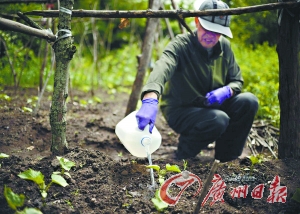 王先生正在为菜浇水,他的女儿是耶鲁大学的博士后。