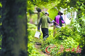 这位老人将弯曲铲绑到扫帚柄上当锄头用。