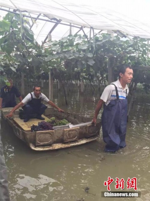 7月12日消息,台风“灿鸿”裹挟强风骤雨袭击浙江沿海,强大威力使浙江多地农田被淹,深处积水已漫至膝盖。在宁波江北洪塘西江村的国东基地里,一片即将丰收上市的葡萄在风中飘摇零落。为及时抢收果实,减少损失,心急火燎的果农划着自制小船,在木板上半蹲着抢收葡萄。吴红波摄