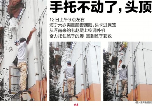 事发12日上午9点左右,海宁市区相院里小区11幢2楼朝北的保笼中挂着一个6岁左右的男孩子,头卡在铁栅中间,双手死死抓着铁条。同楼一阿姨发现后,立马报警。这时,一位40岁左右的男子,二话没说,立刻抓住落水管爬到男孩下面的空调外机上,用头顶住男孩双脚,一直坚持到男孩的父亲赶到,将孩子救下。