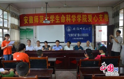 7月13日上午9时,赴四川洪雅“红烛行动”爱心支教夏令营开学典礼正式举行。洪雅县关心下一代委员会常务副主任周明弟、洪雅县柳江镇团委书记刘彬、柳江镇派出所副所长胡柯、柳江镇中心小学教导主任张利琴、安徽师范大学生命科学学院政治辅导员何所惧、洪雅县老年志愿者王永康等出席了典礼。