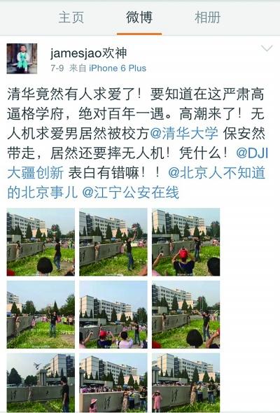 法制晚报讯(记者 马晓晴)近日,男生在清华大学东门外操作无人机,向女生表白的消息在微博热传。7月10日,微博发布者接受记者采访时称,无人机升空后不久,便被清华保安“迫降”。