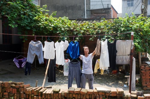 李雯愉在家中晾晒衣服(7月14日摄)。