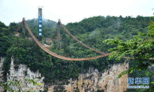 当日,张家界大峡谷玻璃桥猫道架设完工,正式进入主缆施工阶段。据悉,张家界大峡谷玻璃桥总长430米、宽6米,建成后将是世界首座斜拉式高山峡谷玻璃桥。目前,大桥电梯井、栈道等附属设施已全部建成,桥塔、锚洞等主体工程也已完工。建设方正在进行索鞍、桥面骨架铺设、桥面玻璃制作等施工,力争于2015年下半年竣工。新华社记者龙弘涛 摄