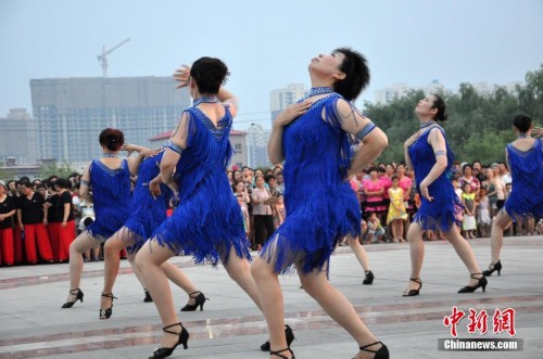 7月14日,河南各地普遍高温,在汝南天中山公园正在举行广场舞大赛,300名大妈齐跳广场舞秀火辣身材,引众人围观。中新社发张建 摄