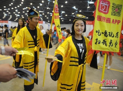 7月25日,山西太原一招聘会现场,某用人单位的工作人员装扮成道士模样,发放招聘广告吸引求职者。