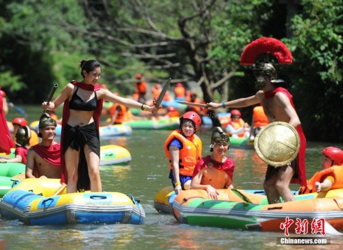 7月29日,两位“勇士”在水上决斗。当日,湖南平江连云山的漂流河道上,工作人员与游客装扮成斯巴达勇士,在水面上展开了一场复古式的水上决斗。中新社发杨华峰 摄