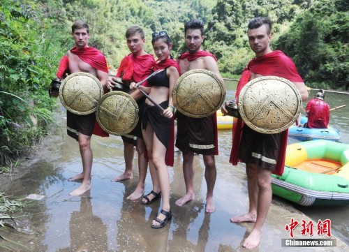 7月29日,湖南平江连云山的漂流河道上硝烟弥漫。当日,工作人员与游客装扮成斯巴达勇士,在水面上展开了一场复古式的水上决斗。中新社发杨华峰 摄