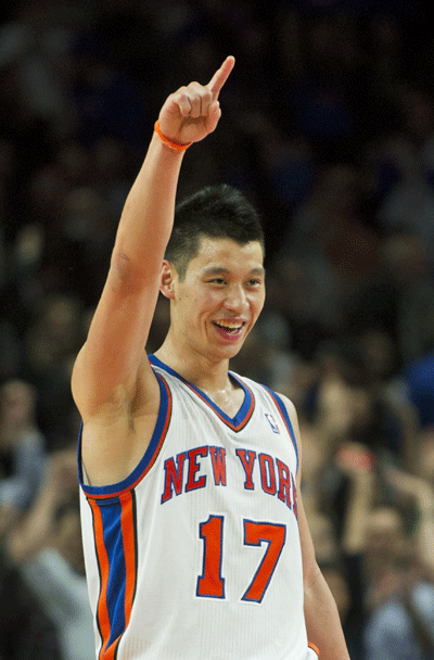 New York Knicks guard Jeremy Lin celebrates after his long pass hit Knicks forward Amare Stoudemire for a layup against the Cleveland Cavaliers in the fourth quarter of their NBA basketball game at Madison Square Garden in New York, February 29, 2012. [Photo\Agencies] |